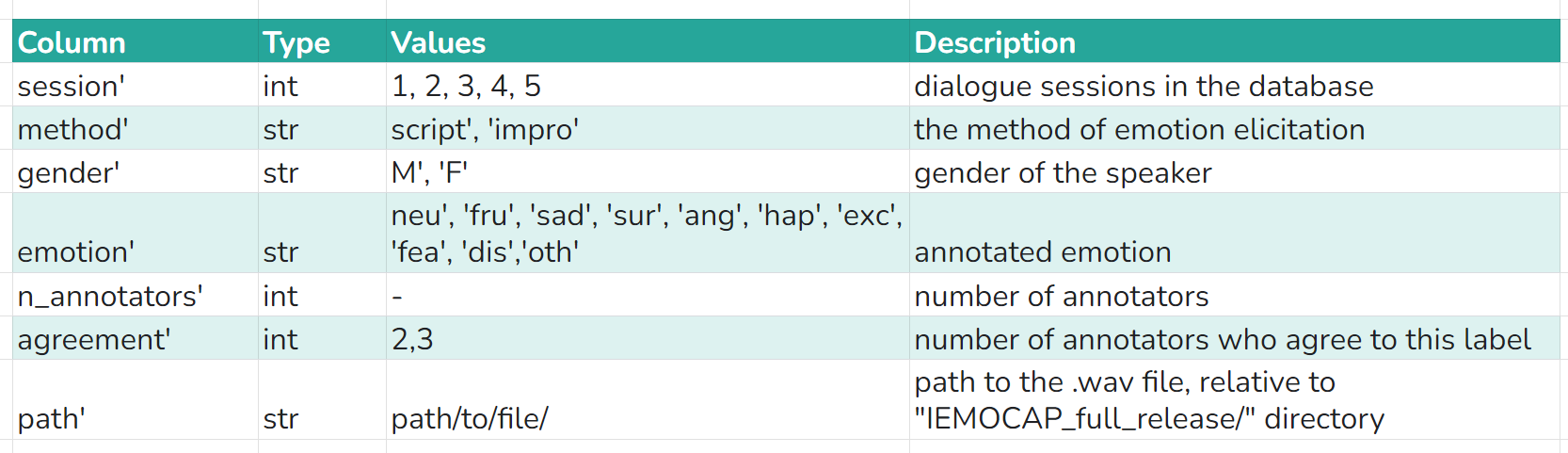 This dataset contains IEMOCAP emotion speech database metadata in dataframe, and the path to each .wav file.